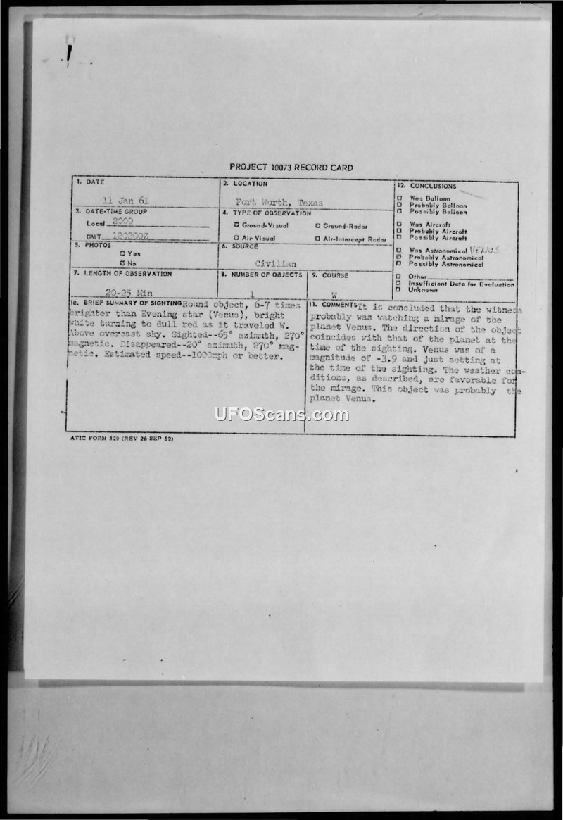 This document details a series of UFO sightings in Texas in January 1961, investigated by the Air Force under Project 10073. While some reports were attributed to astronomical phenomena like Venus, others remained undetermined, reflecting the military's rigorous but skeptical evaluation process.