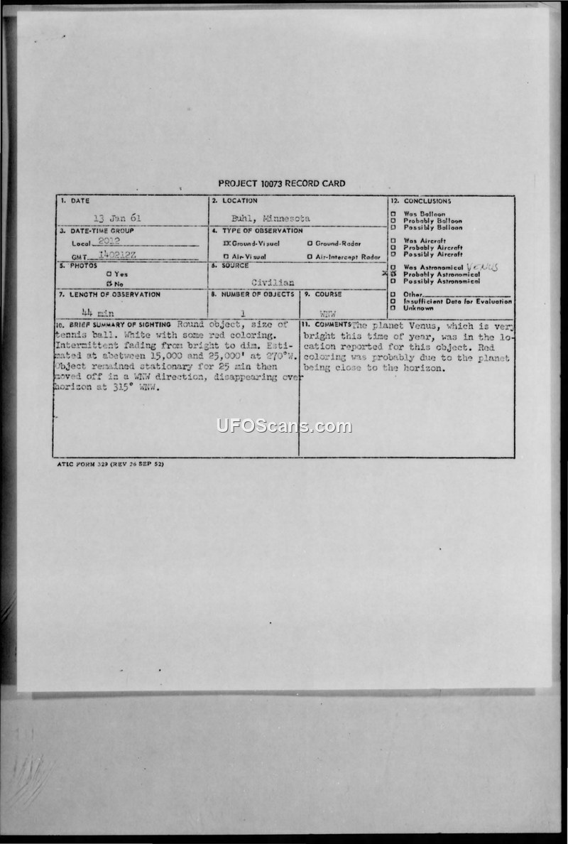 A sighting of a round, white object in Buhl, Minnesota, on January 14, 1961, was officially identified by ATIC as the planet Venus.