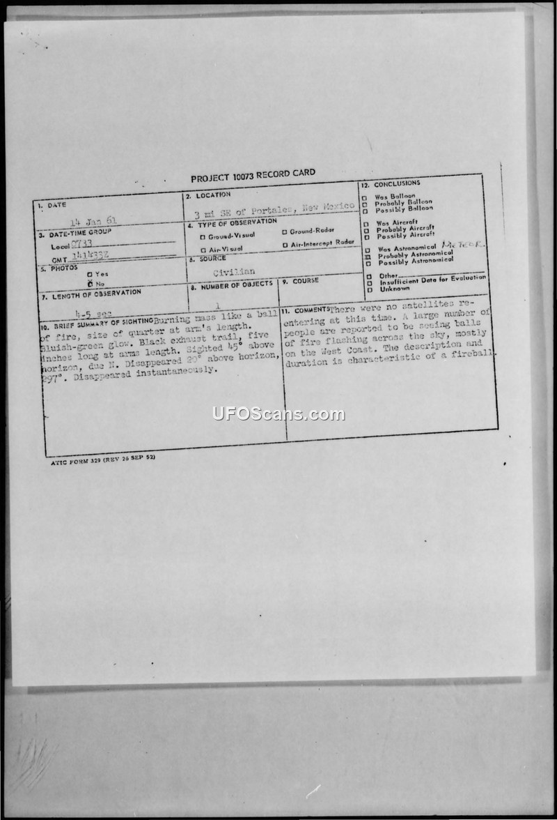 A civilian in Portales, New Mexico, reported a fireball-like object on January 14, 1961. ATIC concluded the object was a meteor.