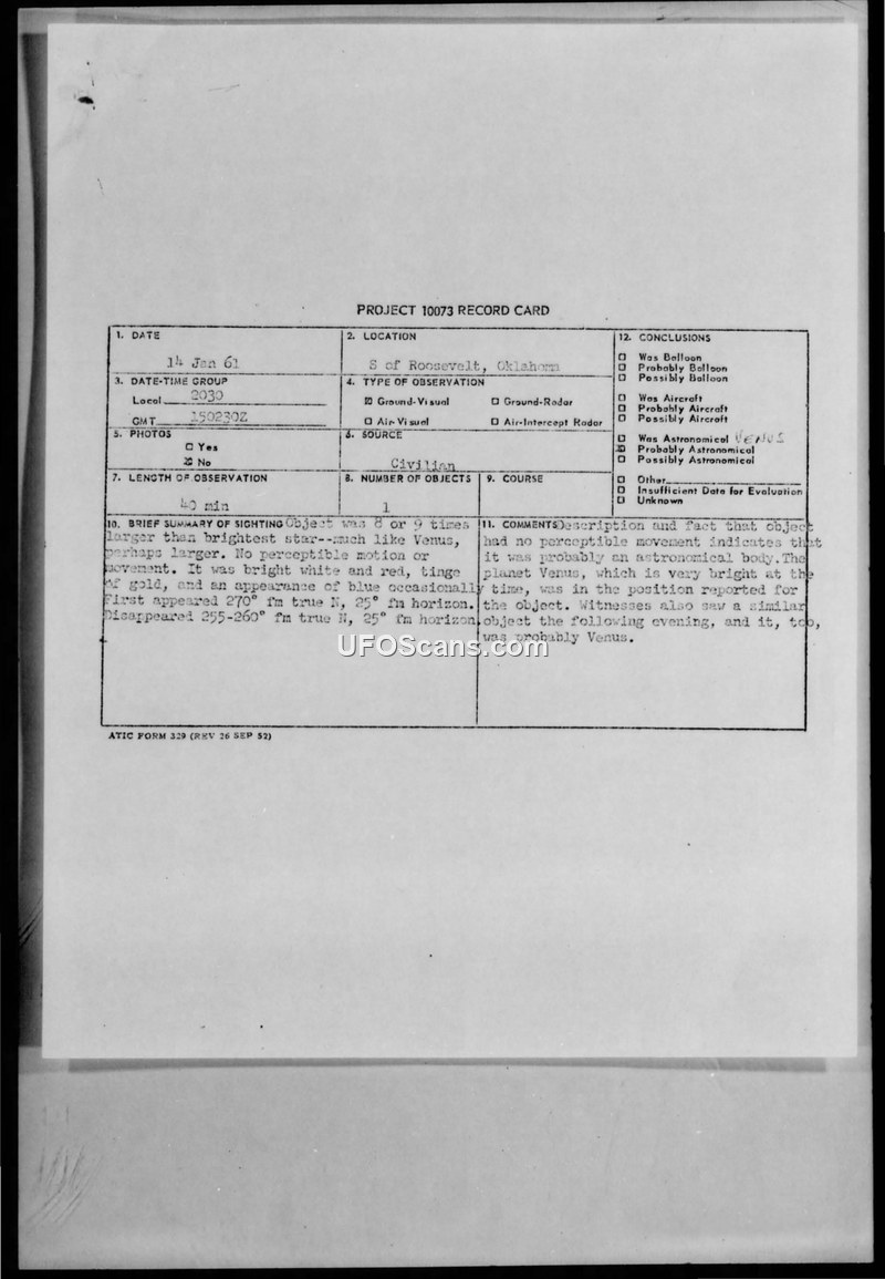 This document is a collection of Project 10073 record cards and correspondence regarding a series of UFO sightings in the vicinity of Sheppard Air Force Base, Texas, during January 1961. The reports detail multiple incidents occurring between January 9 and January 15. One primary report concerns a sighting on January 14, 1961, by a program director and weatherman from KFDX-TV, who observed an object while driving south of Roosevelt, Oklahoma. The witness described the object as bright white and red with a tinge of gold and occasional blue, appearing significantly larger than the brightest star. The object was observed for approximately 40 minutes, moving in a straight line from horizon to horizon. The witness noted that the object appeared to be an astronomical body, and the official conclusion on the record card suggests it was likely the planet Venus. Other reports included in the file describe sightings by military personnel, such as Major Warren R. Aiken and Major Donald P. Taylor, who observed an object on January 9, which they concluded was likely a meteorite or space debris. A sighting on January 11 by a civilian woman was dismissed by the investigating officer as an illusion or a publicity stunt, noting that her husband did not see the object when she pointed it out. The correspondence from the Air Intelligence Branch at Sheppard AFB to the Aerospace Technical Intelligence Center at Wright-Patterson AFB highlights the difficulty in determining the cause of some sightings, while others were correlated with astronomical phenomena. The investigating officer, 1st Lt. Charles J. McClure, noted discrepancies in the reported times of some sightings, suggesting that the distance between the witness's locations may have caused errors in their accounts. The file includes various sketches and completed questionnaires from witnesses, providing detailed, albeit subjective, descriptions of the objects' appearances and movements.