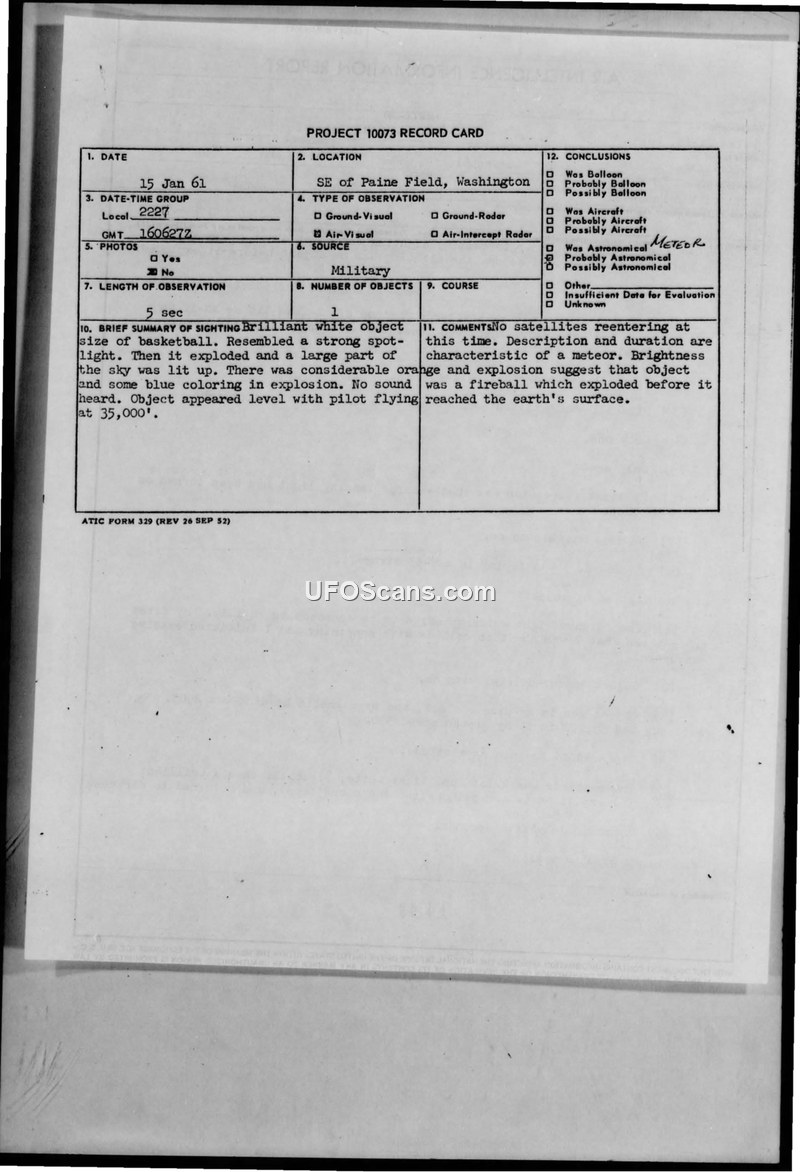On January 15, 1961, at approximately 2227 local time, 1st Lt. W. B. McDonald, flying a T-33 aircraft at an altitude of 35,000 feet, observed a brilliant white object while positioned southeast of Paine Field, Washington. The object, described as being the size of a basketball and resembling a strong spotlight, appeared to be approaching the aircraft rapidly, causing the pilot to initiate evasive maneuvers under the impression that a collision was imminent. The object subsequently exploded, illuminating a large portion of the sky with orange and blue colors before returning to darkness. The entire event lasted approximately five seconds. The pilot noted that there was no sound associated with the event. The report includes corroborating information from Capt. Robert E. Dawson and 1st Lt. James L. Fulk Jr., who were also involved in the flight. The official conclusion reached by the evaluating agency, ATIC, was that the object was a meteor or fireball, noting that the description and duration were characteristic of such phenomena and that the object likely exploded before reaching the earth's surface. The report also mentions that a similar meteor was reported across southern Oregon and northern California on the same date, which illuminated the area near Eureka, California.