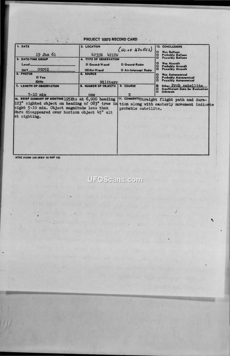 A US Navy pilot reported an unidentified object near the Azores on January 19, 1961. The sighting was officially evaluated as a probable satellite.