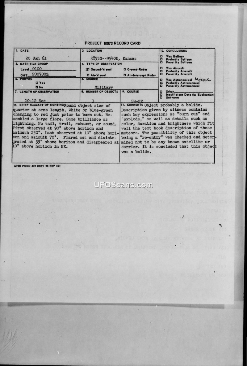 This document details a 1961 UFO sighting in Kansas by two military witnesses. The object was officially identified by the Air Technical Intelligence Center as a bolide (meteor).