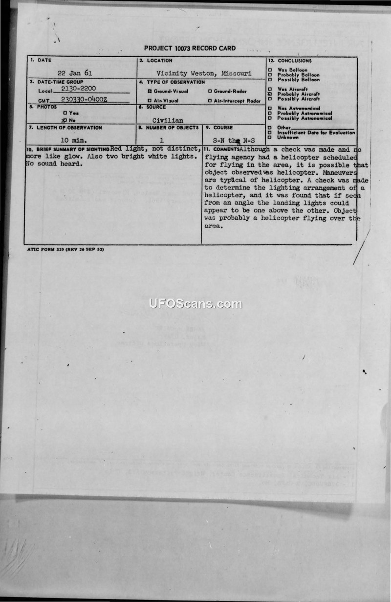 A report detailing a 1961 UFO sighting near Weston, Missouri, by two civilians. The Air Force concluded the object was likely a helicopter, despite being unable to verify any scheduled flights.