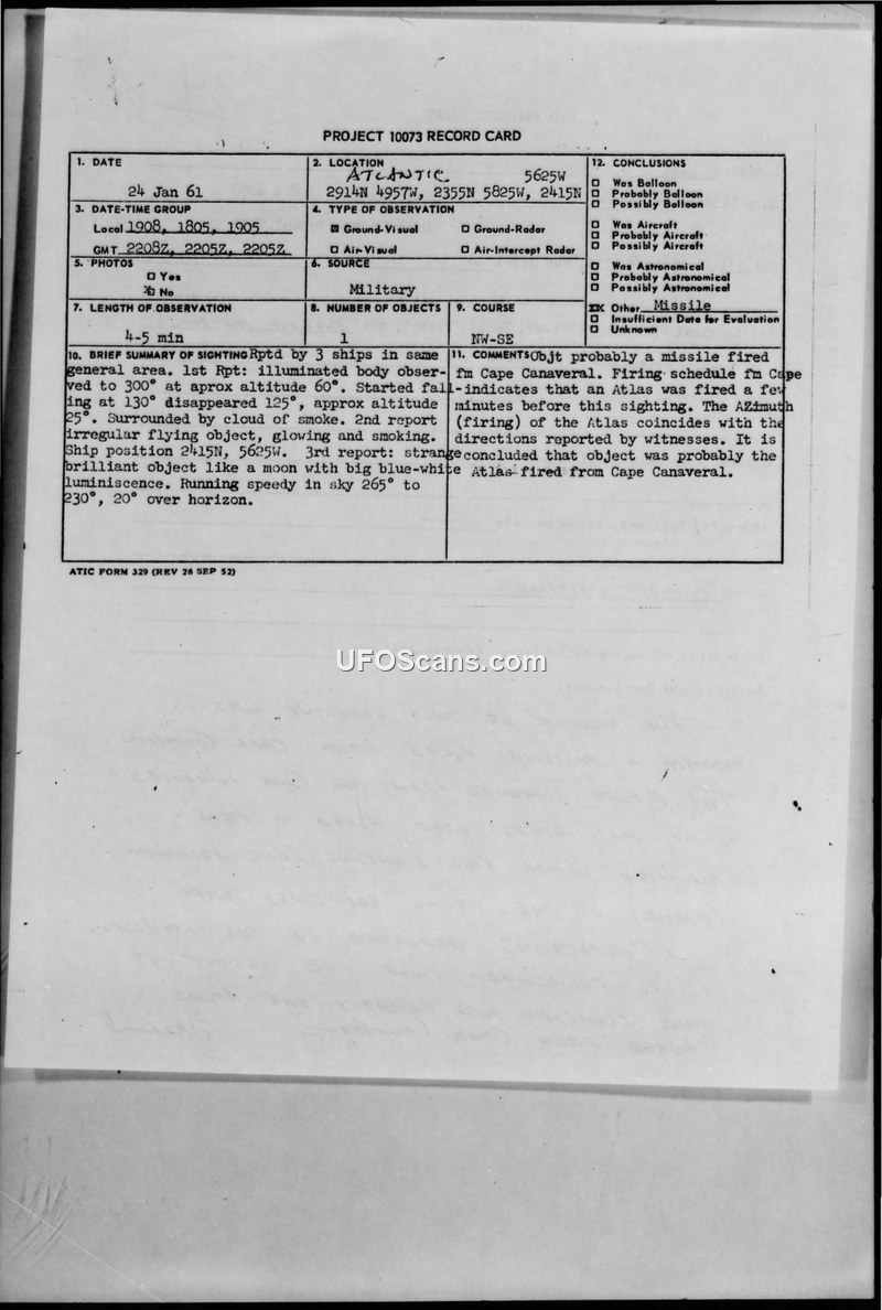Three ships reported an unidentified glowing object in the Atlantic on January 24, 1961. ATIC concluded the object was an Atlas missile launched from Cape Canaveral.
