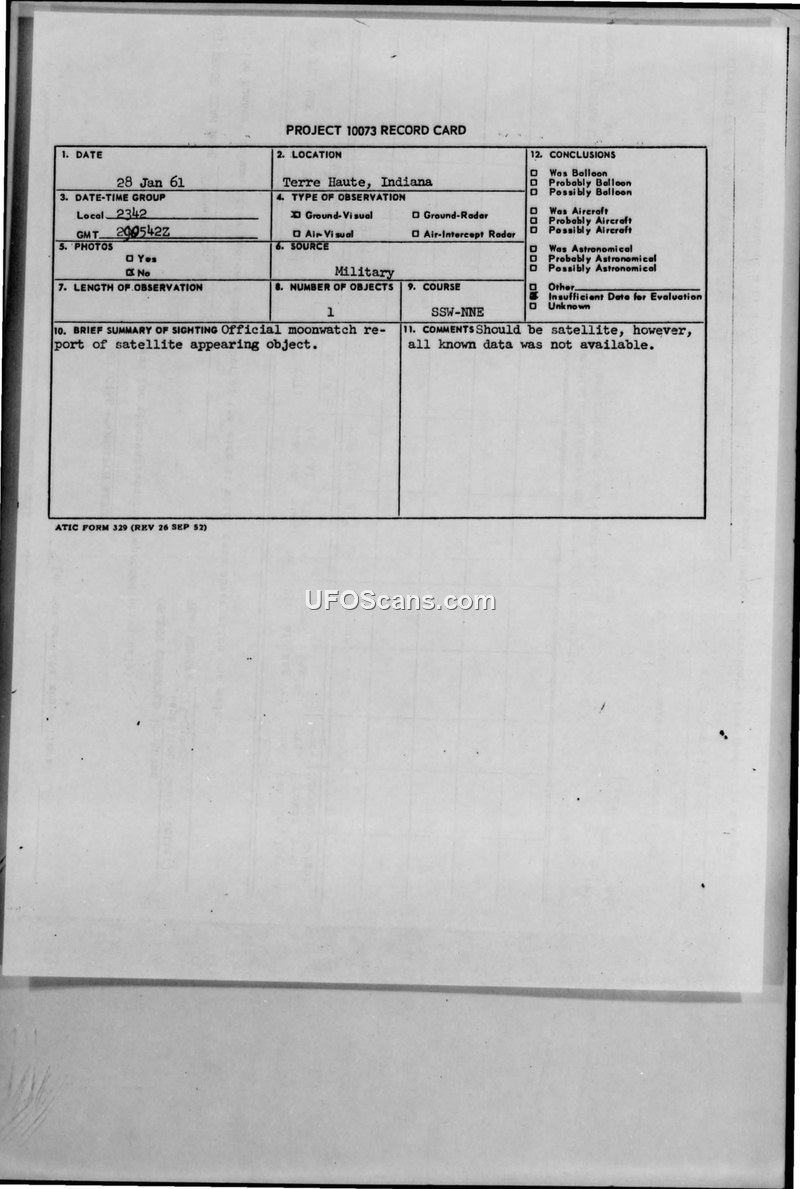 A Moonwatch team in Terre Haute, Indiana, reported an unidentified object on January 27, 1961. While suspected to be a satellite, the report concludes that insufficient data was available for a definitive identification.