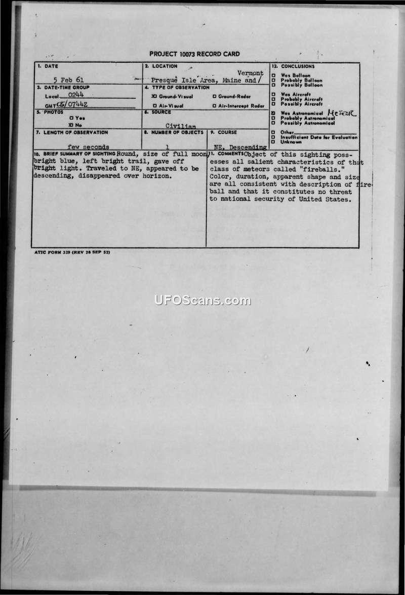 This document collection details a series of Unidentified Flying Object (UFO) sightings reported on February 5, 1961, across Maine, Vermont, and Massachusetts. The reports describe a bright, round object, often characterized as blue, green, or green-white, which was observed traveling in a northeasterly direction before appearing to descend and explode over the horizon. Multiple witnesses, including military personnel and civilian police officers, provided accounts of the event. One military observer, TSgt Homer P. E. Sheridan, described the object as round, glowing light blue, and leaving a bright trail. Another witness, Sgt John Jorge of the Ludlow, Massachusetts police, estimated the object to be three to four times the size of a basketball. The reports were consolidated by the Intelligence Division of the 99th Bomb Wing at Westover Air Force Base. While some initial speculation suggested the object could have been a decaying satellite, such as Discoverer 5, the official conclusion reached by the Air Technical Intelligence Center (ATIC) was that the object possessed all the salient characteristics of a meteor, specifically a 'fireball.' The reports emphasize that the event was widely publicized by the national press, radio, and television outlets. Intelligence officers noted that the size estimates provided by various observers were inconsistent and likely exaggerated, and they concluded that the phenomenon posed no threat to the national security of the United States. The documentation includes various teletype messages (TWX) and supplemental reports (AF Form 112) that track the investigation, including attempts to conduct a helicopter search for debris, which yielded no results due to snow-covered roads and the nature of the event. The file also notes that some observers, such as a civilian in St. Johnsbury, Vermont, believed they were tracking a Russian Sputnik satellite, though this was considered a separate matter.