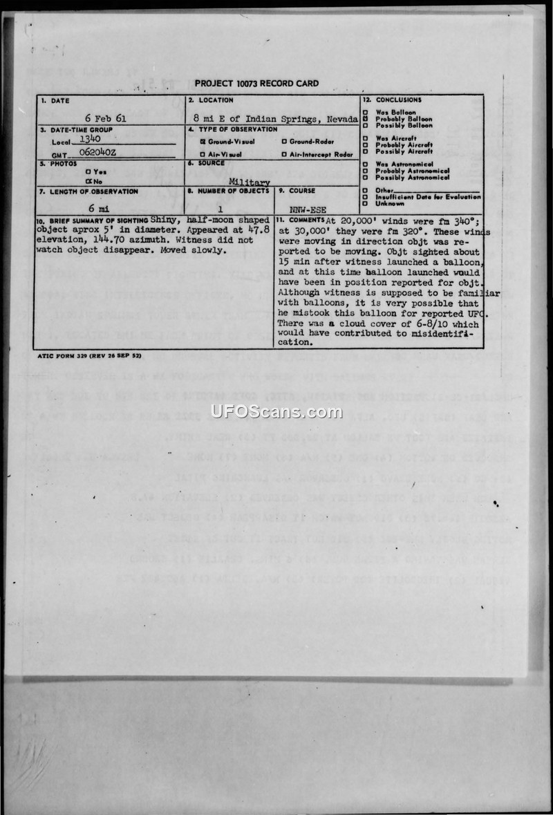 Project 10073 Record Card — Sighting near Indian Springs, Nevada, 6 Feb 61