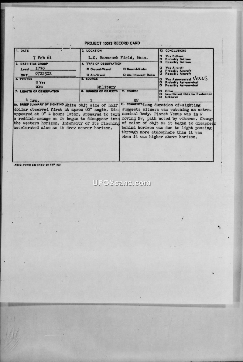 A sighting of a white object over L.G. Hanscom Field on February 7, 1961, was officially identified as the planet Venus. The report was filed by Captain Richard N. Woda following an observation by A3C Rudolph A. L. Smith.
