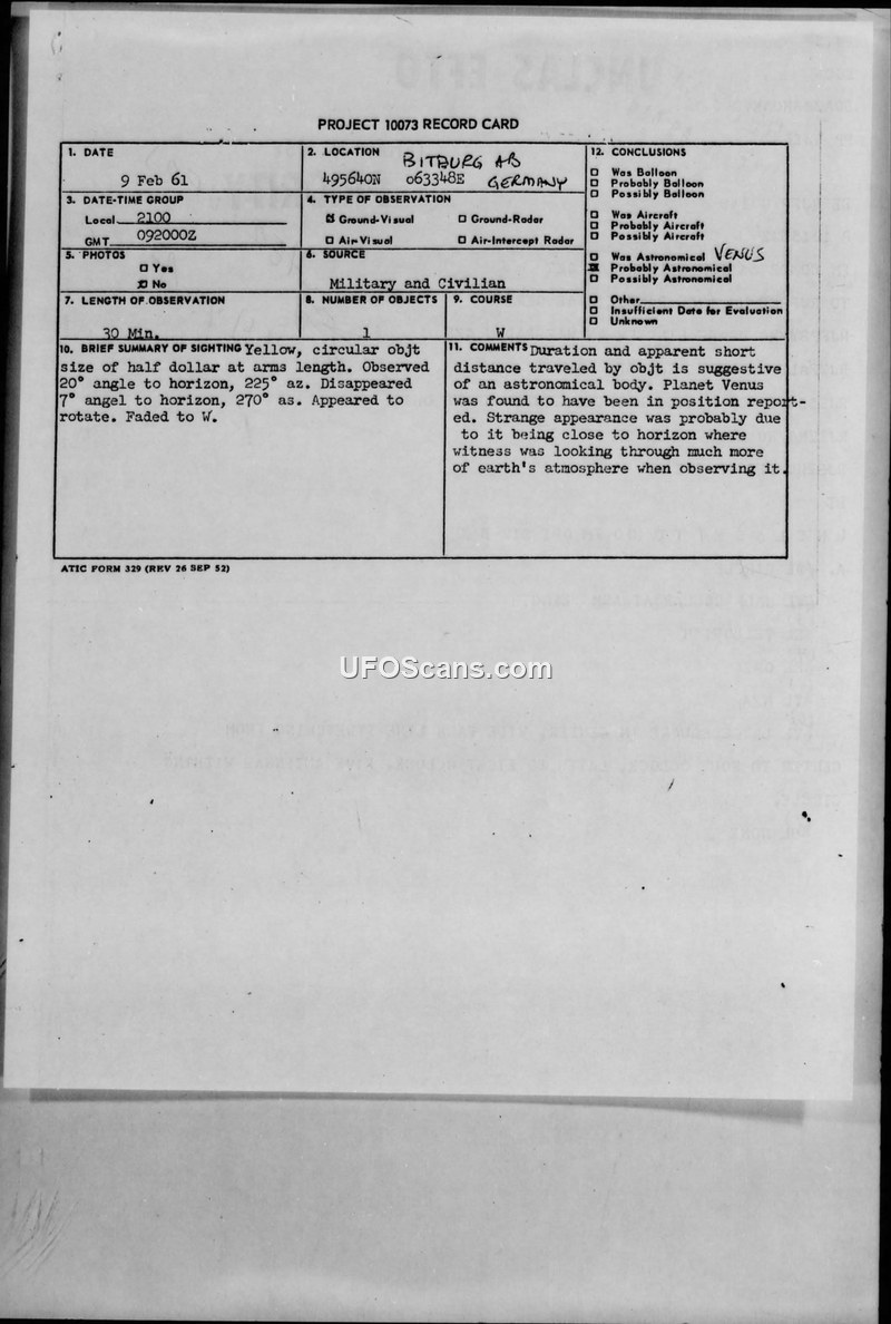 Project 10073 Record Card — Bitburg AB, Germany, 9 February 1961