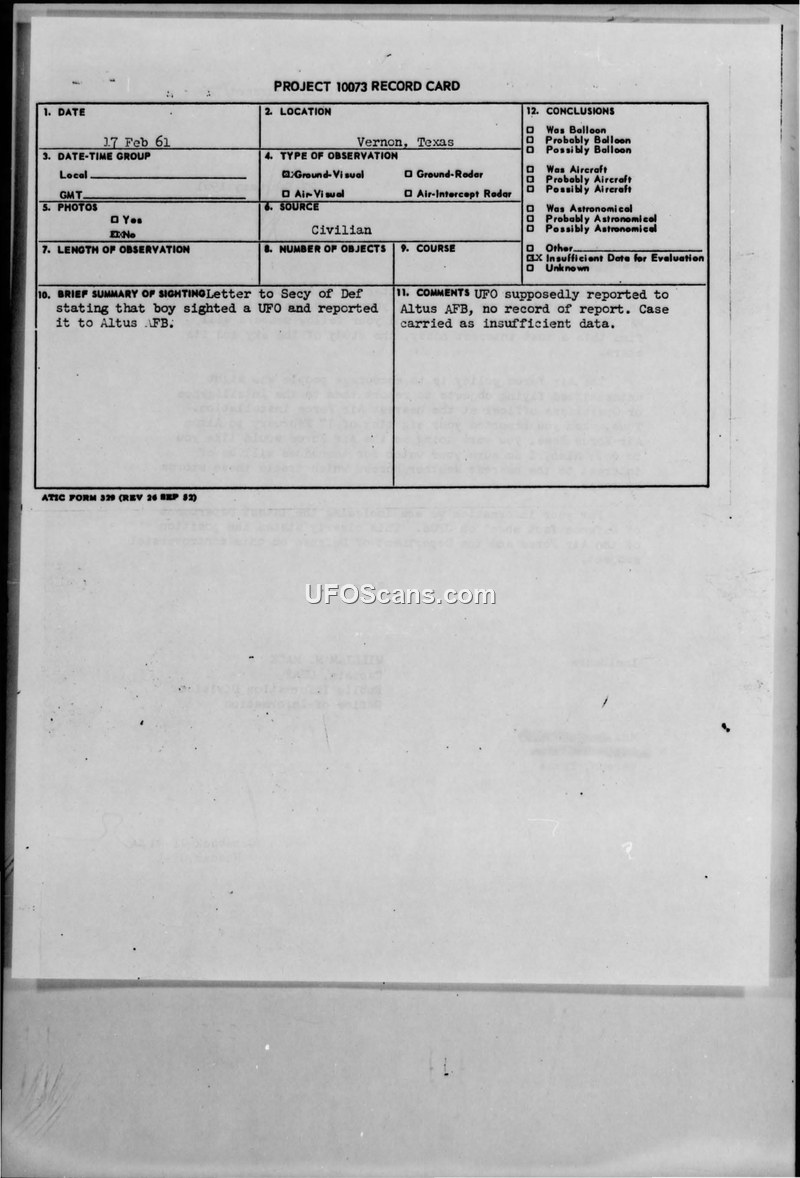 Project 10073 Record Card — Vernon, Texas, 17 February 1961
