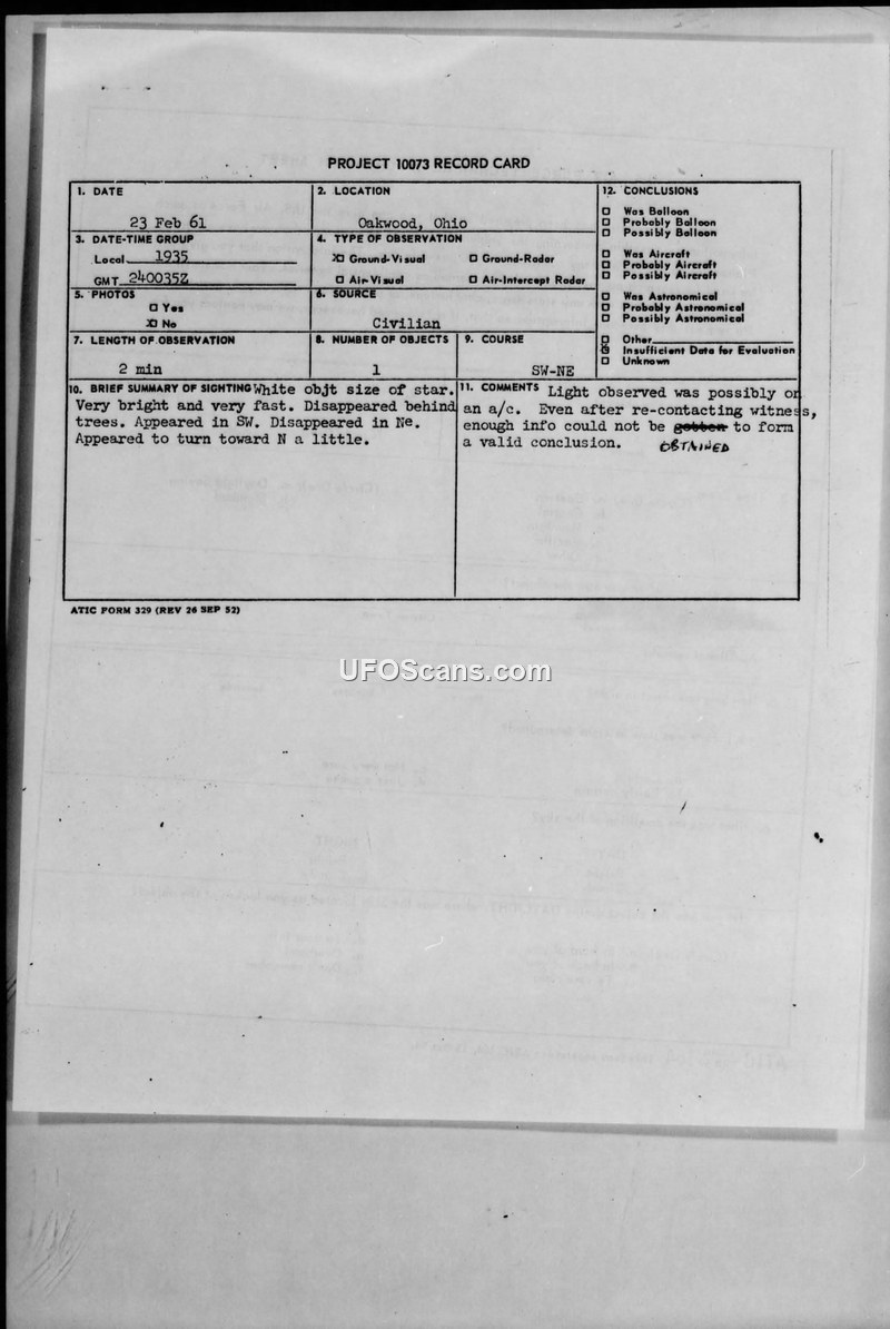 Project 10073 Record Card — Oakwood, Ohio, 23 Feb 61