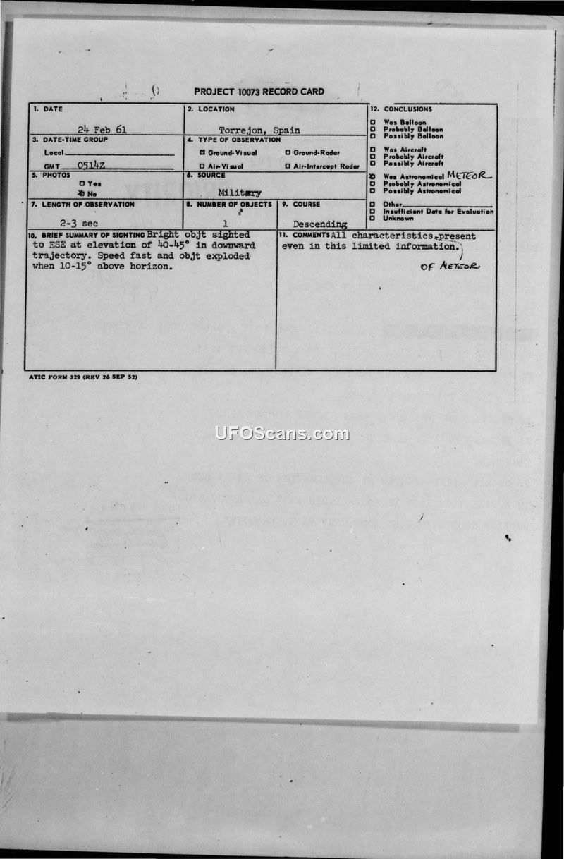 Project 10073 Record Card — Torrejon, Spain, 19 February 1961