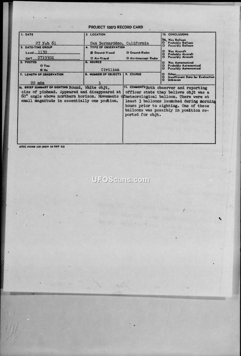 A February 1961 sighting of a white, round object in San Bernardino was investigated by the USAF. After checking regional weather balloon launch data, officials concluded the object was likely a meteorological balloon and recommended closing the case.