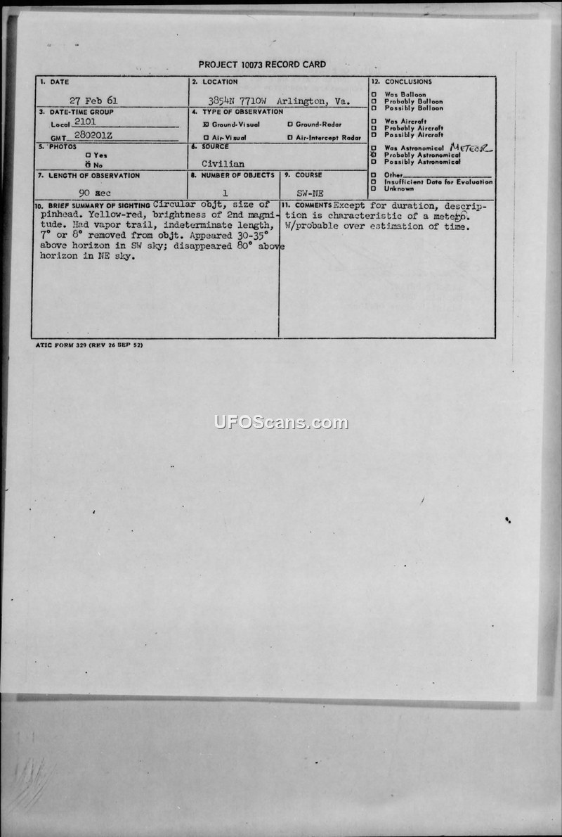 A civilian engineer reported a circular, yellow-red object with a vapor trail over Arlington, Virginia, on February 27, 1961. The Air Force concluded the object was likely a meteor, noting a probable overestimation of the 90-second duration.