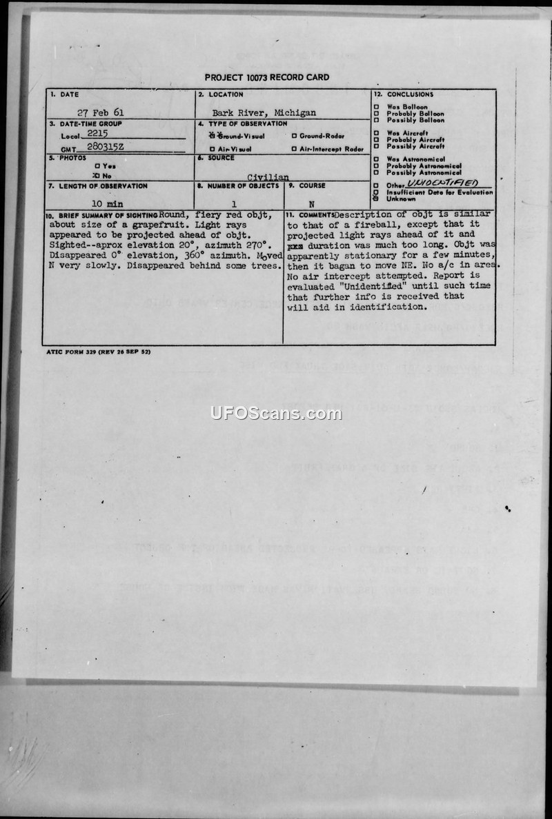 Project 10073 Record Card and UFO Report 03-U-61-001 — Bark River, Michigan