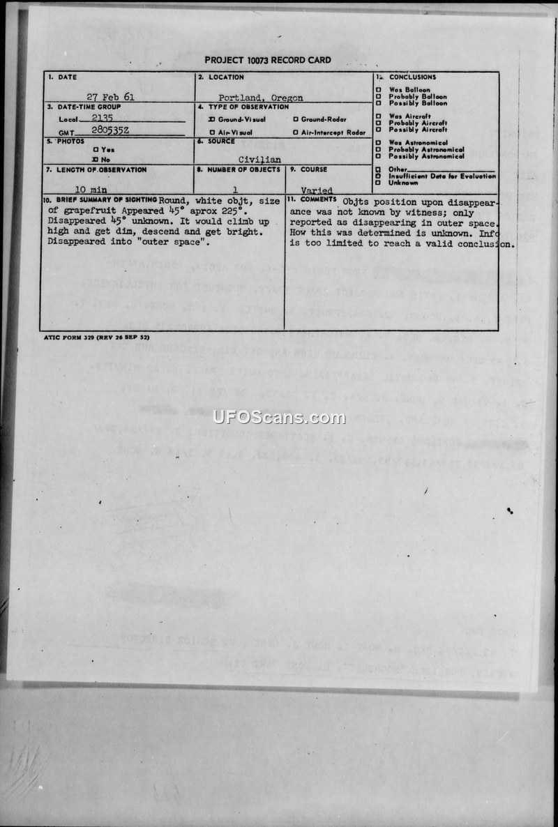 A civilian in Portland, Oregon, reported a 10-minute sighting of a grapefruit-sized, white, round object on February 27, 1961. The military investigation concluded that the information was too limited to reach a valid conclusion.
