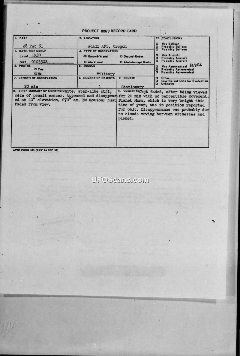 On February 28, 1961, at 1930 hours local time, three military personnel—Captain Robert K. Garrabrant, Major Leonard D. Michaud, and Major Eli V. Draggoo—observed an unidentified object from Adair Air Force Station in Oregon. The witnesses described the object as a white, star-like entity, approximately the size of a pencil eraser, exhibiting exceptional brilliance. The object was observed at an elevation of 40 degrees and an azimuth of 270 degrees. Throughout the 20-minute duration of the sighting, the object remained stationary with no perceptible movement. The report notes that the object eventually faded from view. Following an analysis by the Combat Intelligence Section of the Portland Air Defense Sector, the phenomenon was officially identified as the planet Mars. The investigators concluded that the planet's high visibility during that time of year accounted for the sighting, and the eventual disappearance of the object was likely caused by cloud cover moving between the observers and the planet. The documentation includes a Project 10073 record card, an analysis sheet, and a technical summary. The classification of the correspondence was cancelled on May 12, 1969.