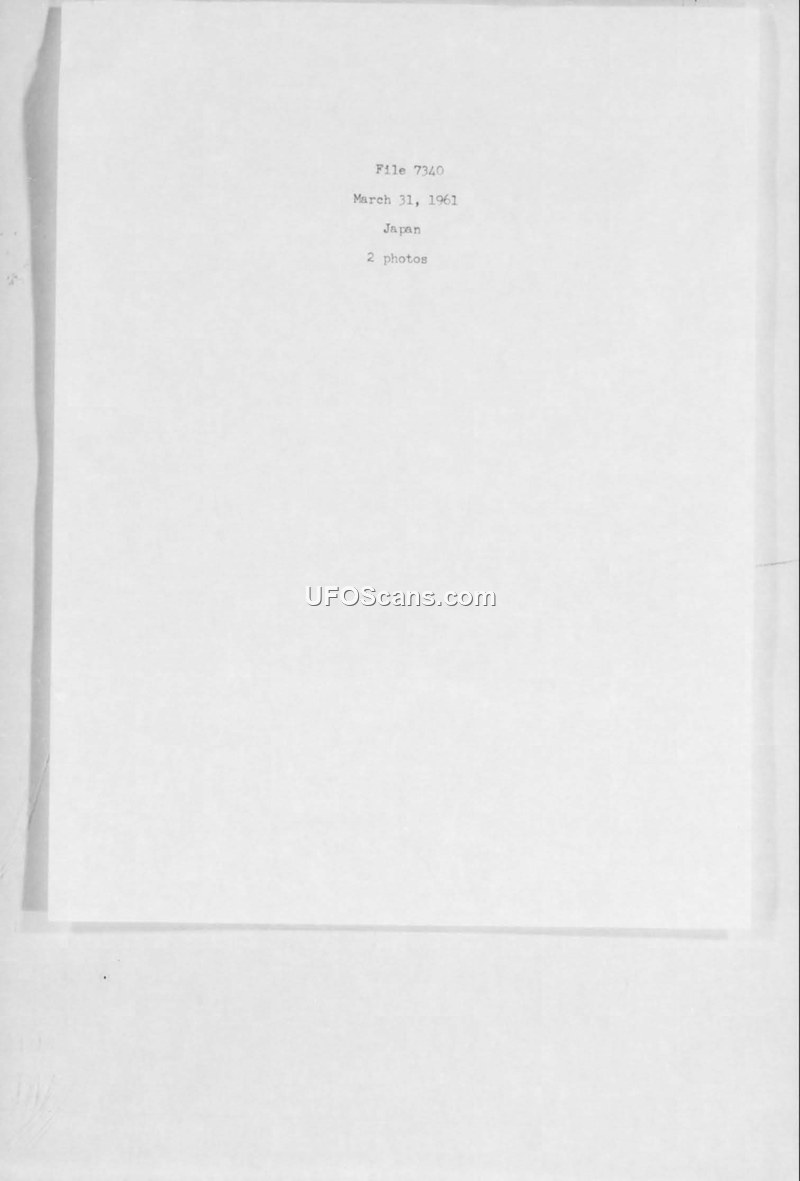 This document, identified as File 7340, consists of a brief administrative record and two photographic images documenting an unidentified aerial phenomenon sighting in Japan on March 31, 1961. The file is marked as unclassified and originates from the Foreign Technology Division of the Air Force Systems Command (AFSC). The documentation provides no narrative details regarding the circumstances of the sighting, the witnesses involved, or any technical analysis of the object captured in the photographs. The images show a cityscape with a single, light-colored, circular object visible in the sky above the buildings. The document serves primarily as a repository for the visual evidence associated with the reported event.