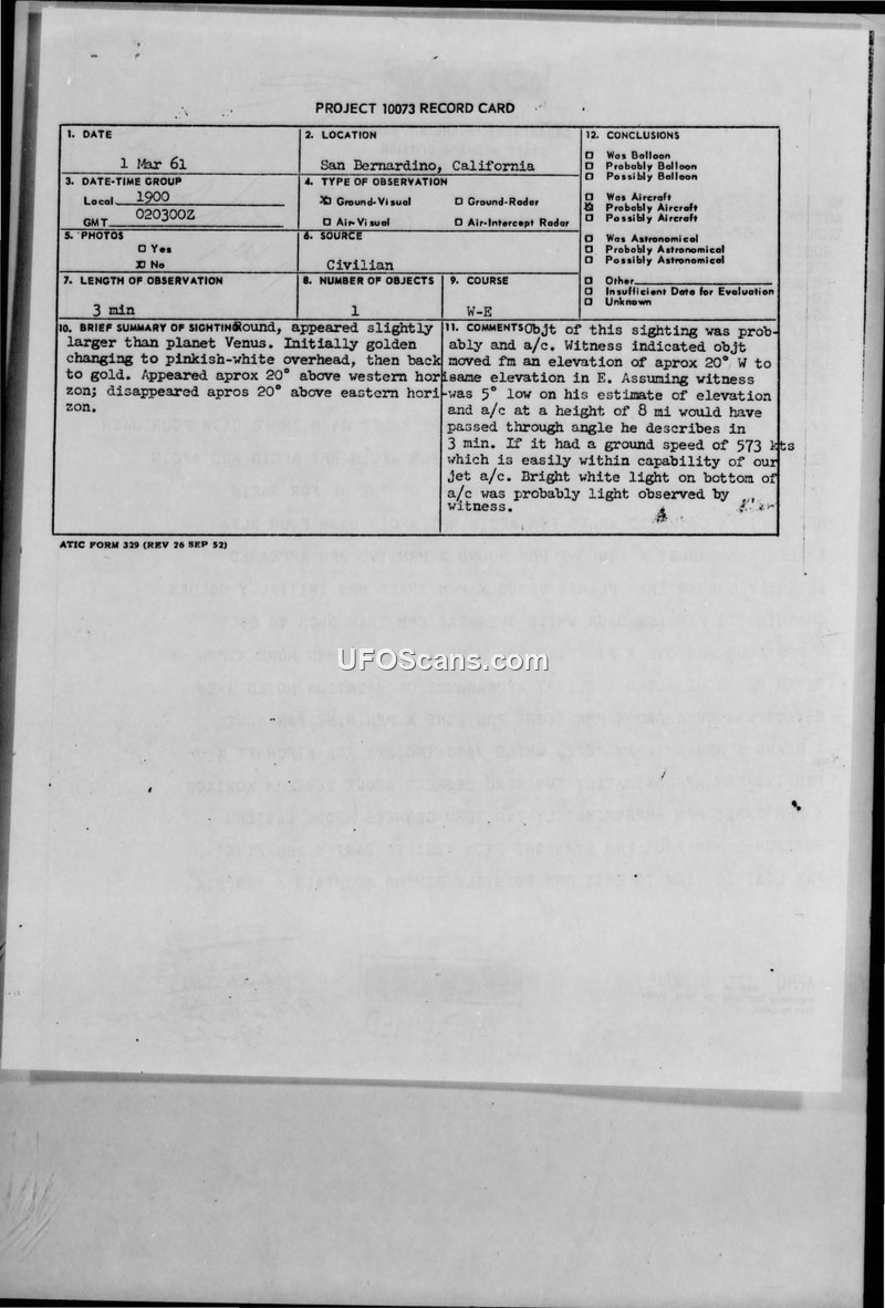 Project 10073 Record Card — San Bernardino, California, 1 March 1961