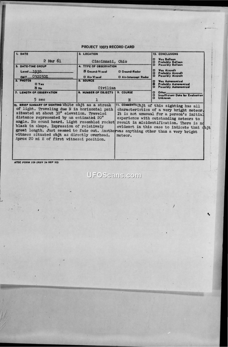 This document collection details a series of reports concerning an unidentified aerial phenomenon observed on the evening of March 2, 1961, in the vicinity of Cincinnati, Ohio. Multiple witnesses, including an employee of General Electric and a resident of Richmond, Indiana, reported seeing a bright, streak-like object traveling due north at a high altitude. The object was described as having a white or light-green color, with a trailing smoke-like effect, and was visible for approximately 5 to 20 seconds. Witnesses noted that the object did not make any sound and eventually faded from view. The reports were forwarded to the Wright Air Development Division and subsequently evaluated by the Foreign Technology Division (FTD). The FTD analysis determined that the object was a fireball, a type of meteor. This conclusion was supported by the fact that the object was observed from several widely separated locations, including Springfield, Dayton, and Cincinnati, which indicated a high-altitude trajectory consistent with a meteor rather than a localized aircraft or atmospheric phenomenon. Although one report suggested the possibility of exhaust from plant furnaces at a Union Carbide chemical plant, the official military assessment remained that the object was a meteor. The documentation includes several 'Project 10073' record cards, technical information sheets completed by the witnesses, and internal correspondence between military offices confirming the nature of the sighting. The consensus among the investigators was that the witnesses had observed a very bright meteor, and that the initial misidentification was common for individuals without experience in observing such astronomical events.