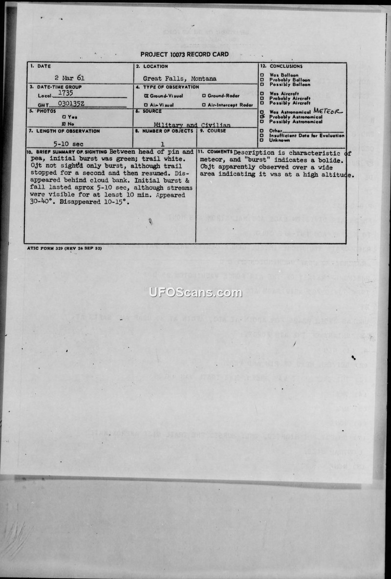A sighting of a green burst and white trail over Great Falls, Montana, on 2 March 1961 was reported by multiple witnesses. Air Force intelligence considered the possibility of a meteor or a space vehicle reentry.