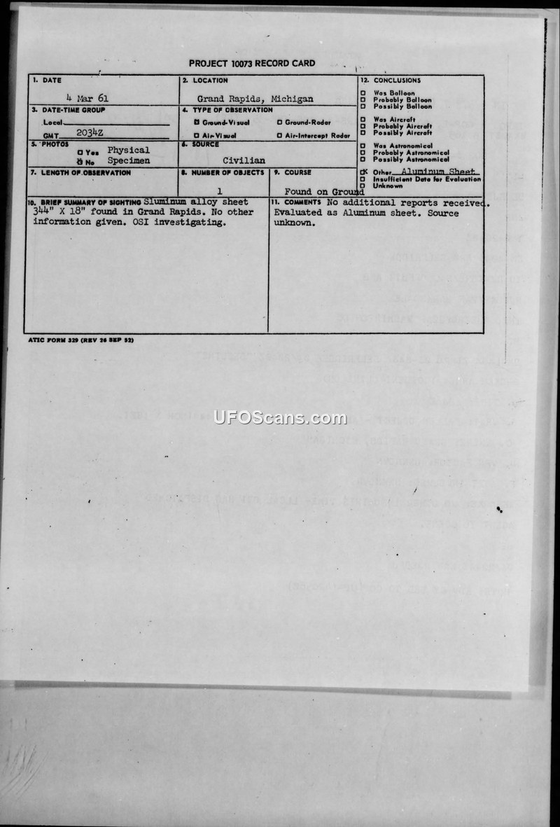 PROJECT 10073 RECORD CARD — Grand Rapids, Michigan, 4 Mar 61