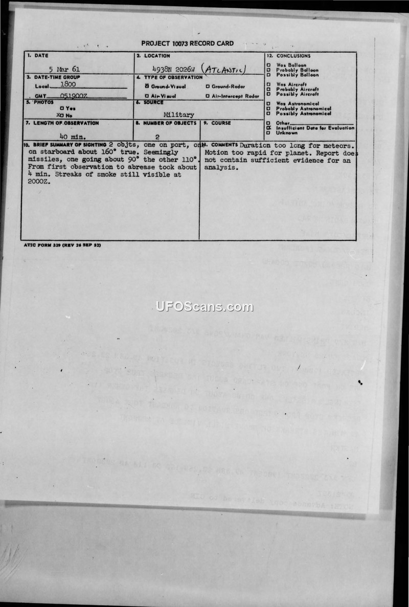 A merchant vessel reported two unidentified objects in the Atlantic on March 5, 1961. The military investigation concluded there was insufficient evidence for analysis.