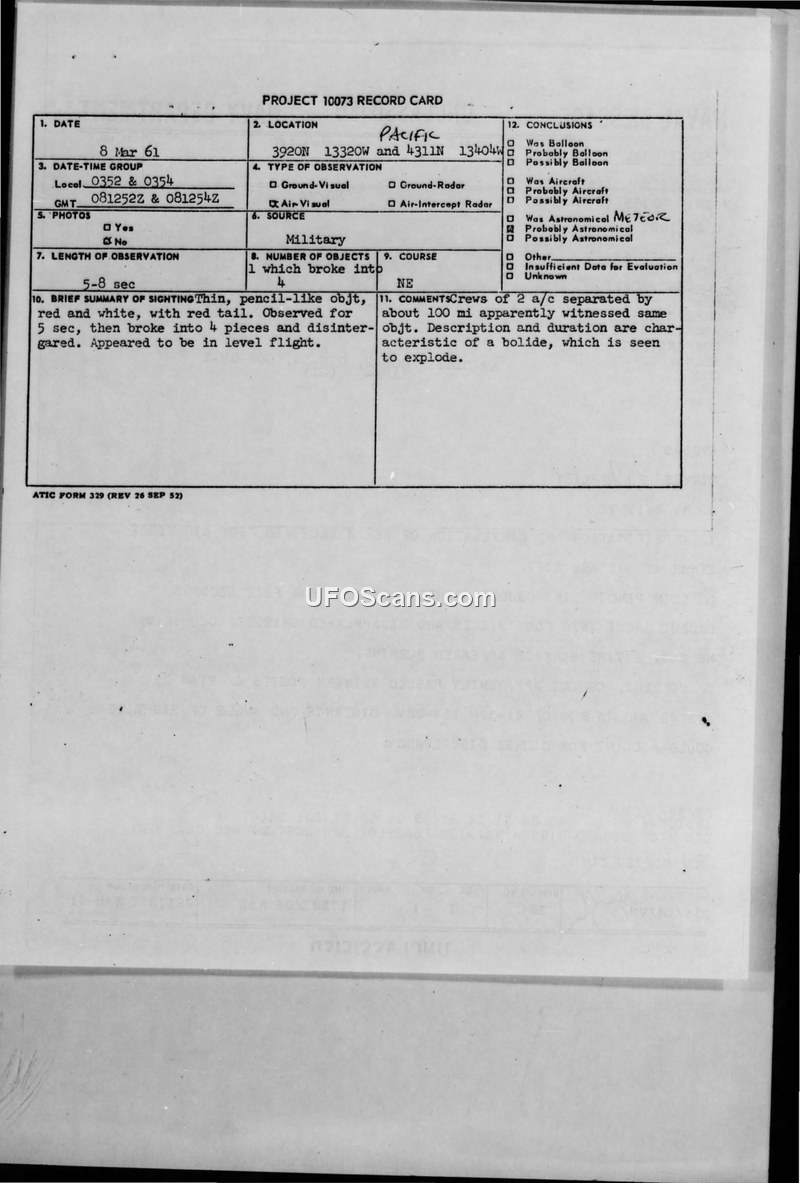 On March 8, 1961, two aircraft crews in the Pacific observed a red and white pencil-like object that disintegrated in flight. While officially classified as a bolide, intelligence reports suggested it was the reentry of a space vehicle.