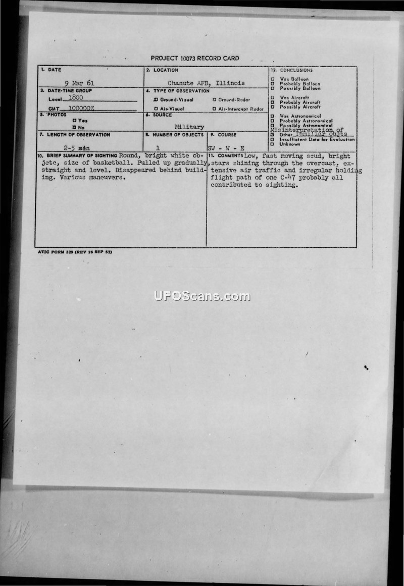 Five military personnel at Chanute AFB reported a UFO sighting on March 9, 1961. The investigation concluded the event was a misidentification of stars, aircraft, and atmospheric conditions, noting that witness accounts appeared rehearsed.