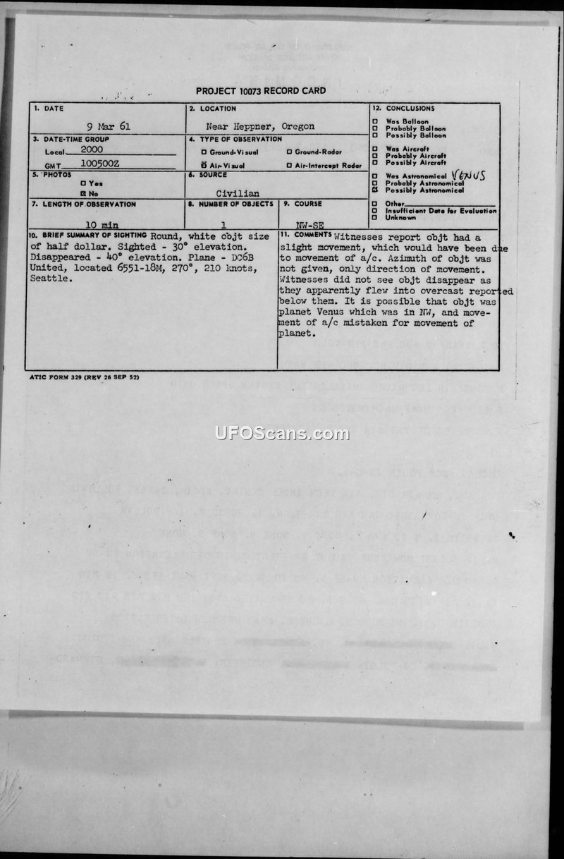 On March 9, 1961, at approximately 2000 local time, the crew of a United Airlines DC-6B aircraft (flight 6551) observed an unidentified aerial object near the Heppner intersection in Oregon. The object was described as round, white, and approximately the size of a half-dollar. The sighting lasted for ten minutes, during which the object was observed at an elevation of 30 degrees, eventually disappearing at an elevation of 40 degrees. The flight crew reported a slight movement of the object, which was later assessed by the Air Technical Intelligence Center as likely being the result of the aircraft's own movement. The official conclusion reached by the Air Force was that the object was likely the planet Venus, which was positioned in the northwest at the time. The witnesses reported that they did not see the object disappear, but rather that they flew into an overcast layer that was reported below them. The report includes detailed meteorological data and flight information, noting that the aircraft was flying under VFR conditions on top of cloud layers. The incident was processed under Air Force Regulation 200-2 and forwarded to various commands, including the 25th Air Division and the Air Technical Intelligence Center.