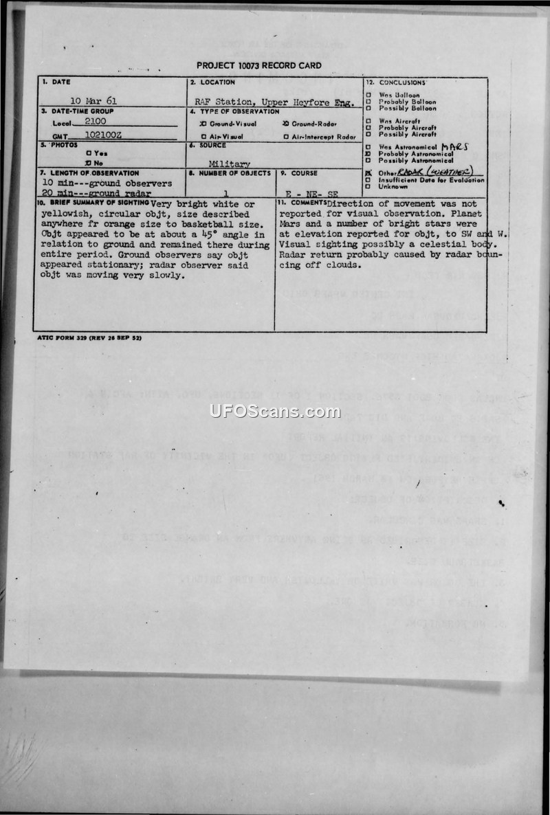On 10 March 1961, at approximately 2100 hours local time, personnel at RAF Upper Heyford in England observed an unidentified flying object. The sighting was reported by several individuals, including control tower operators, air police, and a weather observer. The object was described as a very bright, white or yellowish circular entity, ranging in size from an orange to a basketball. It remained at a 45-degree angle in relation to the ground and appeared stationary to ground observers, though radar operators reported it moving very slowly. The object was tracked by radar for approximately 20 minutes, with initial movement due east, followed by a heading of 050 degrees for ten minutes, and a final turn to 100 degrees before contact was lost. An aircraft was vectored to the object's location by Midland Radar Control, but the pilot reported seeing nothing, noting he was at 6,000 feet above the cloud layer. The object was observed to disappear and reappear gradually. No optical aids, such as binoculars, provided any assistance in identifying the object. The weather at the time was generally clear with some haze and ground fog. The base intelligence officer, who compiled the report, noted that there was no air traffic or known balloon releases in the vicinity that could account for the sighting. While a temperature inversion was theorized as a potential cause for the radar return, the brightness of the object made it difficult to explain via reflection. The report concludes that there is no logical explanation for the sighting and that no physical evidence, other than tape recordings at the Midland control center, exists.