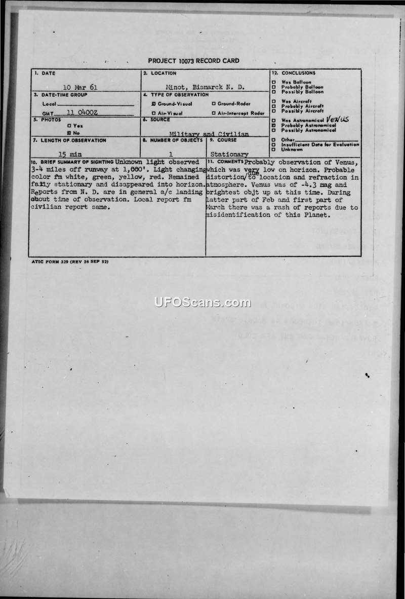 On March 10, 1961, at approximately 0400Z, an unidentified light was observed near Minot, North Dakota. The object was reported to be three to four miles off the runway at an altitude of 1,000 feet. Witnesses described the light as changing colors—specifically white, green, yellow, and red—and remaining fairly stationary for a duration of fifteen minutes before disappearing into the horizon. The sighting was intercepted by the command post at the base via a conversation on the FAA Minnesota long line. Reports were also received from sheriffs in Bismarck, North Dakota, who had been tracking the light. An aircraft landed near the time the light disappeared but did not observe it. Local civilian reports corroborated the details provided by the base. Following the report, the Air Technical Intelligence Center (ATIC) evaluated the incident under Project 10073. The official conclusion reached was that the object was the planet Venus, which was at a magnitude of -4.3 and appeared very low on the horizon. The report notes that atmospheric refraction and distortion, combined with the planet's high visibility, led to a 'rash of reports' in the region during late February and early March 1961. The incident was documented via a series of military messages and a formal record card, with Major Robert J. Friend and Colonel Philip G. Evans overseeing the administrative processing of the report in accordance with Air Force Regulation 200-2.