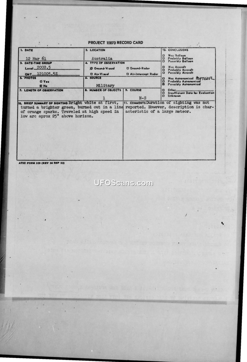 Project 10073 Record Card: Sighting in Australia, 12 March 1961