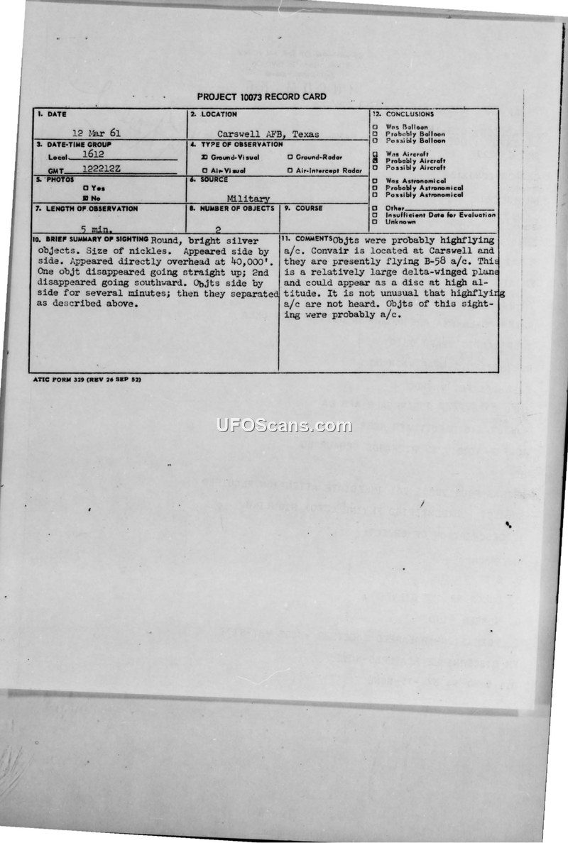 On March 12, 1961, at 2212Z, a UFO sighting was reported at the USAF Hospital at Carswell AFB, Texas. The witness, SSGT John G. Niber, observed two round, bright silver objects, described as being the size of nickels, positioned side-by-side at an estimated altitude of 40,000 feet. The objects were observed for approximately five minutes. According to the report, one object disappeared by moving straight up, while the second object disappeared by moving southward. The witness reported no sound associated with the objects. A second individual, MSGT Andrew Karol, was also present but was dismissed from the hospital before he could be interviewed. The investigating officer expressed significant reservations regarding the reliability of SSGT Niber, citing a previous head injury that made his account appear incoherent at times. Consequently, the officer concluded that Niber's information could not be judged as reliable or unreliable. The official assessment provided by the Air Technical Intelligence Center (ATIC) suggests that the objects were likely high-flying B-58 aircraft. The report notes that the Convair facility at Carswell operates B-58s, which are large delta-winged aircraft that can appear as discs at high altitudes and are often not audible from the ground. The report concludes that there is no explainable course for the sighting other than the probability that they were aircraft, and confirms that no physical evidence was recovered.