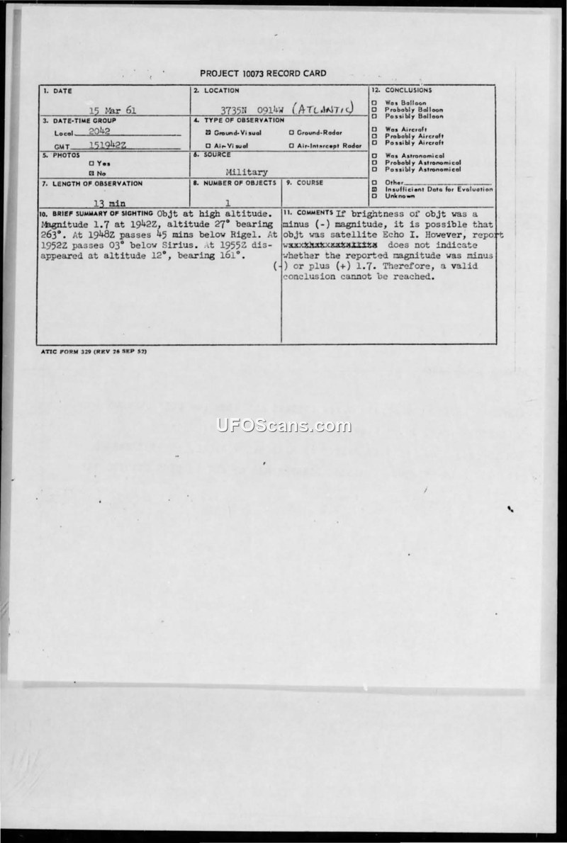 On March 15, 1961, a military report was generated regarding an unidentified airborne object observed at high altitude over the Atlantic at coordinates 37°35'N, 09°14'W. The sighting, which lasted for 13 minutes, was documented via a Project 10073 record card and a supporting staff message from CINCLANTFLT. The object was described as having a magnitude of 1.7. Its trajectory was tracked relative to celestial bodies; at 1948Z, it passed 45 minutes below the star Rigel, and at 1952Z, it passed 3 degrees below the star Sirius. The object eventually disappeared at an altitude of 12 degrees and a bearing of 161 degrees. The official evaluation by ATIC noted that if the object's brightness was of a negative magnitude, it might have been the Echo I satellite. However, because the original report failed to specify whether the 1.7 magnitude was positive or negative, the investigators concluded that a valid identification could not be reached, leaving the case as having insufficient data.
