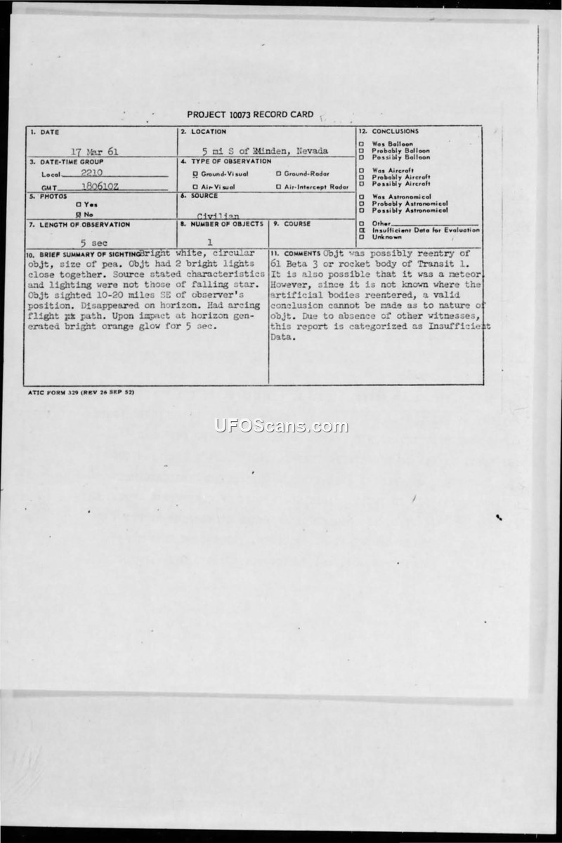 Project 10073 Record Card and Message — 17 March 1961 Sighting, Minden, Nevada