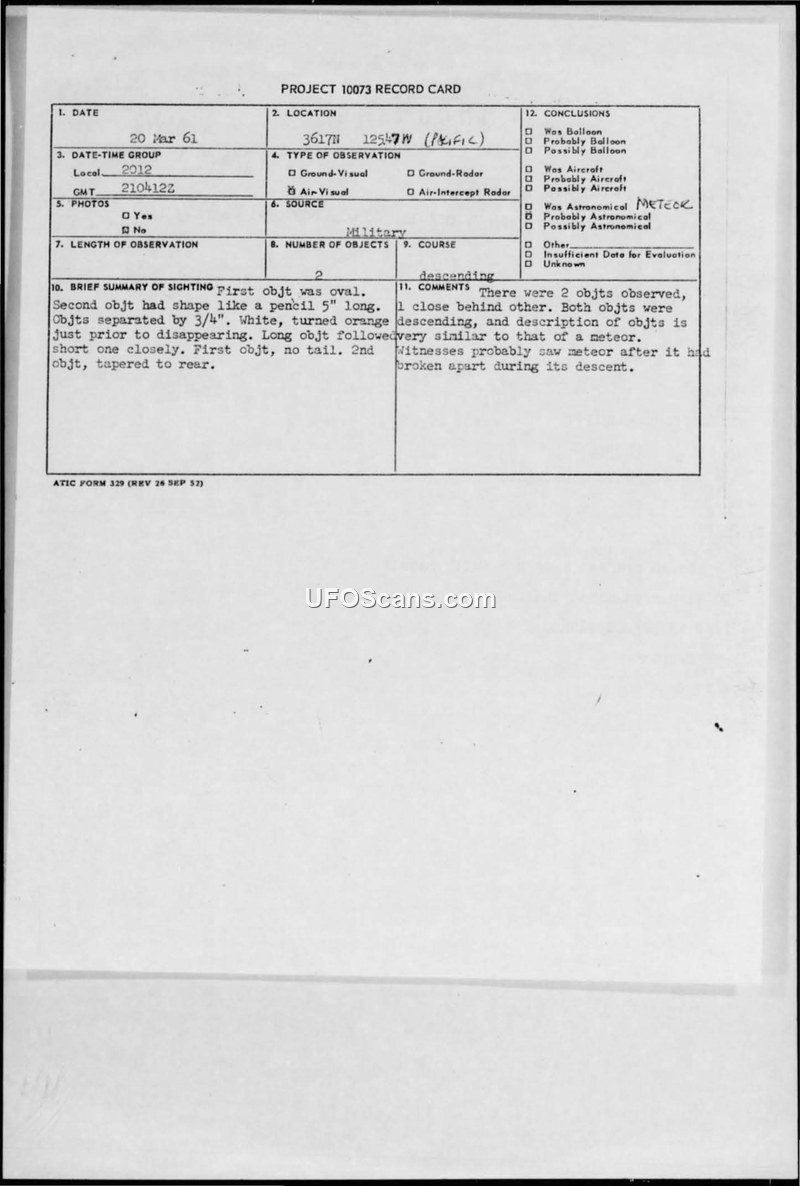 On March 20, 1961, at 210412Z, the crew of an RC-121 aircraft, identified as 'Ethan 51', observed two unidentified objects while flying at an altitude of 11,500 feet over the Pacific Ocean at coordinates 36-17N 125-47W. The sighting lasted approximately five seconds. The witnesses described the first object as oval-shaped and the second as pencil-shaped, approximately five inches long. The objects were observed to be white in color, turning orange just before they disappeared. The long object followed the shorter one closely, and the second object was noted to be tapered at the rear. The flight path was described as a straight descent at an approximate 10-degree angle. The weather conditions were reported as clear with unlimited visibility. The incident was documented as an after-landing report in accordance with AFR 200-2 format. While the Chief of Intelligence for the 552nd AEW&C Wing suggested the possibility of a re-entry of an earth satellite, the official Project 10073 record card concludes that the witnesses likely observed a meteor that had broken apart during its descent.