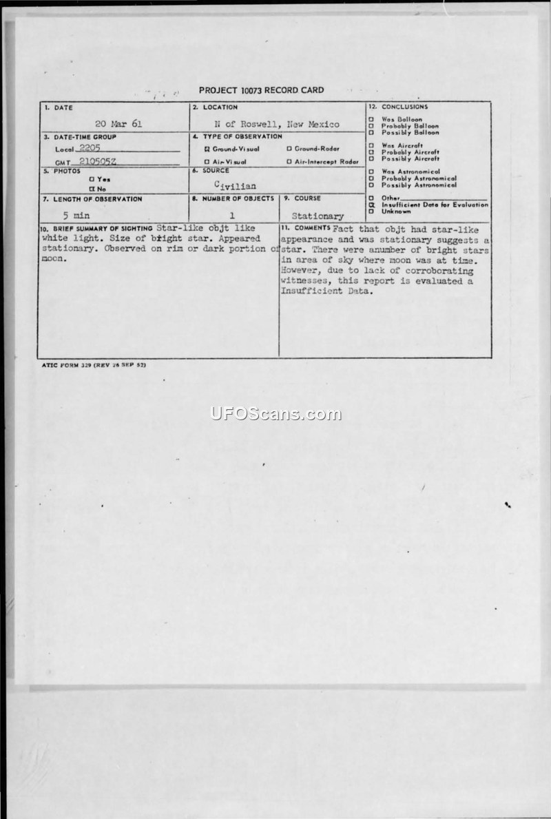 Project 10073 Record Card and Incident Report — Roswell, New Mexico, March 1961