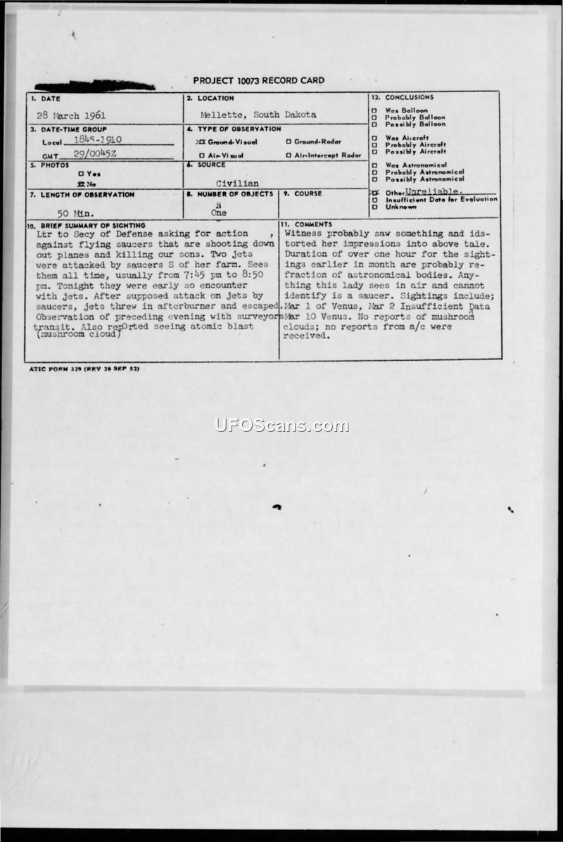 This document consists of a Project 10073 record card and an accompanying UFO Analysis Sheet regarding a report from a civilian in Mellette, South Dakota, dated March 28, 1961. The witness submitted a letter to the Secretary of Defense claiming that 'flying saucers' were shooting down planes and killing sons. She described an incident where two jets were attacked by saucers south of her farm, forcing the jets to use their afterburners to escape. The witness also claimed to have observed an atomic blast, described as a 'mushroom cloud,' earlier in March. The official evaluation concludes that the witness distorted her impressions and that the sightings were likely astronomical bodies, specifically Venus. The report notes that no aircraft incidents or mushroom clouds were reported by official channels, leading the investigators to classify the report as unreliable.