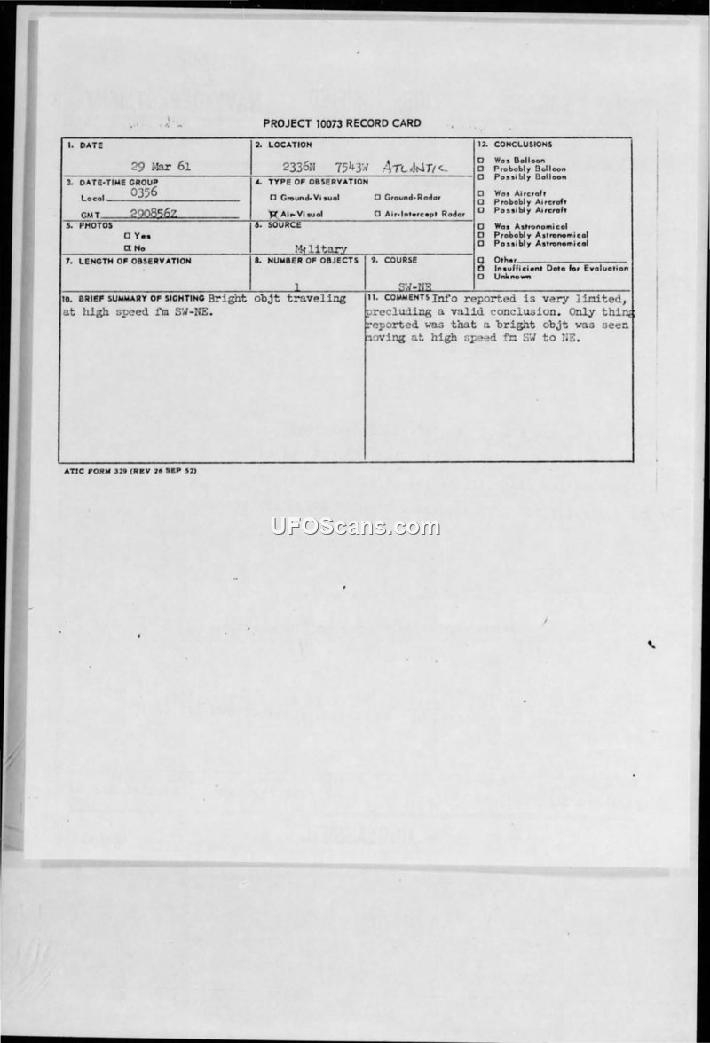 A bright object was reported moving at high speed over the Atlantic on March 29, 1961. Military authorities determined the information was insufficient to reach a valid conclusion.
