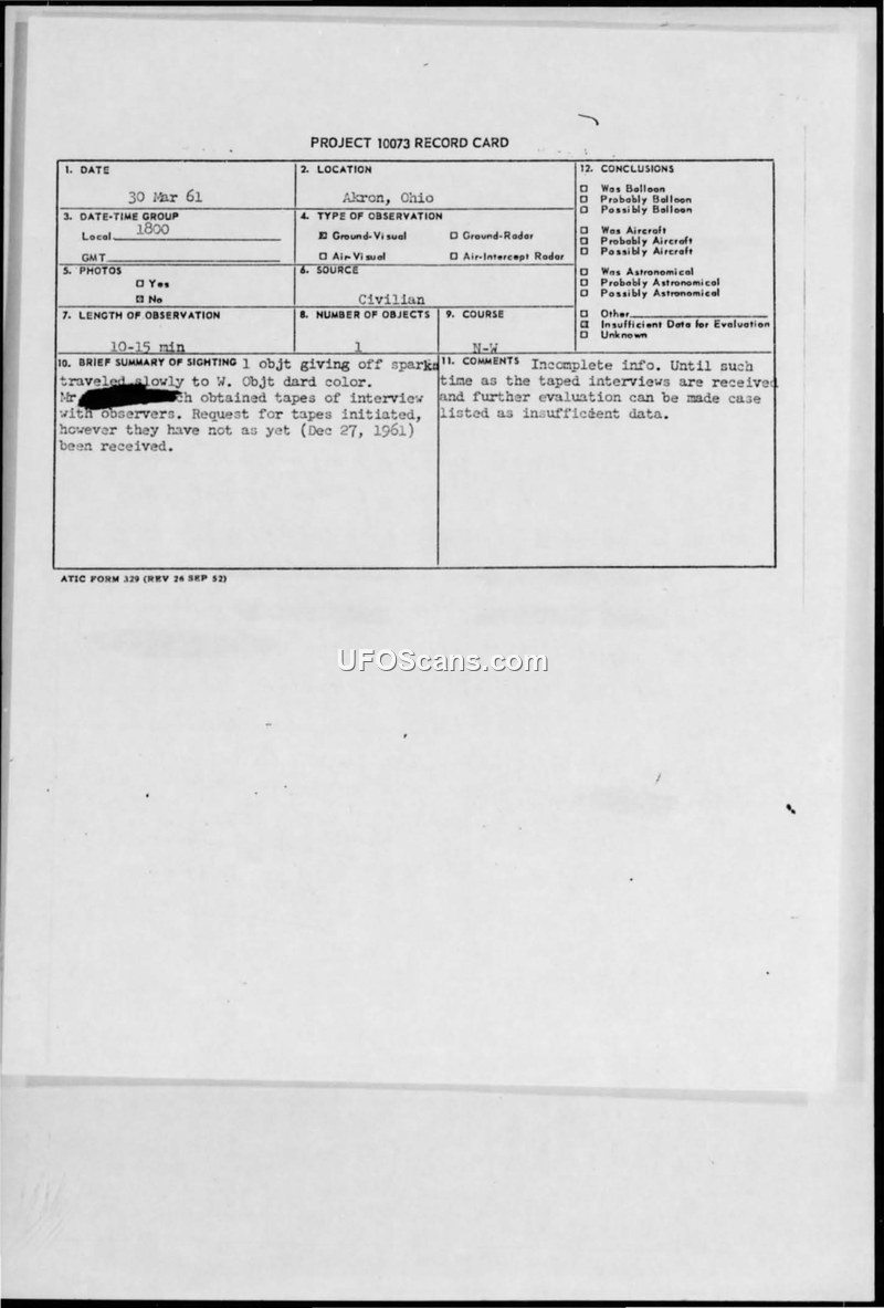 Project 10073 Record Card — Akron, Ohio, 30 March 1961