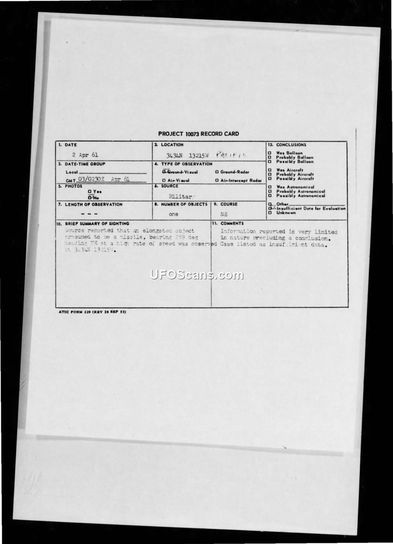 A report of an unidentified elongated object sighted in the Pacific on April 2, 1961. The military investigation concluded there was insufficient data to identify the object.