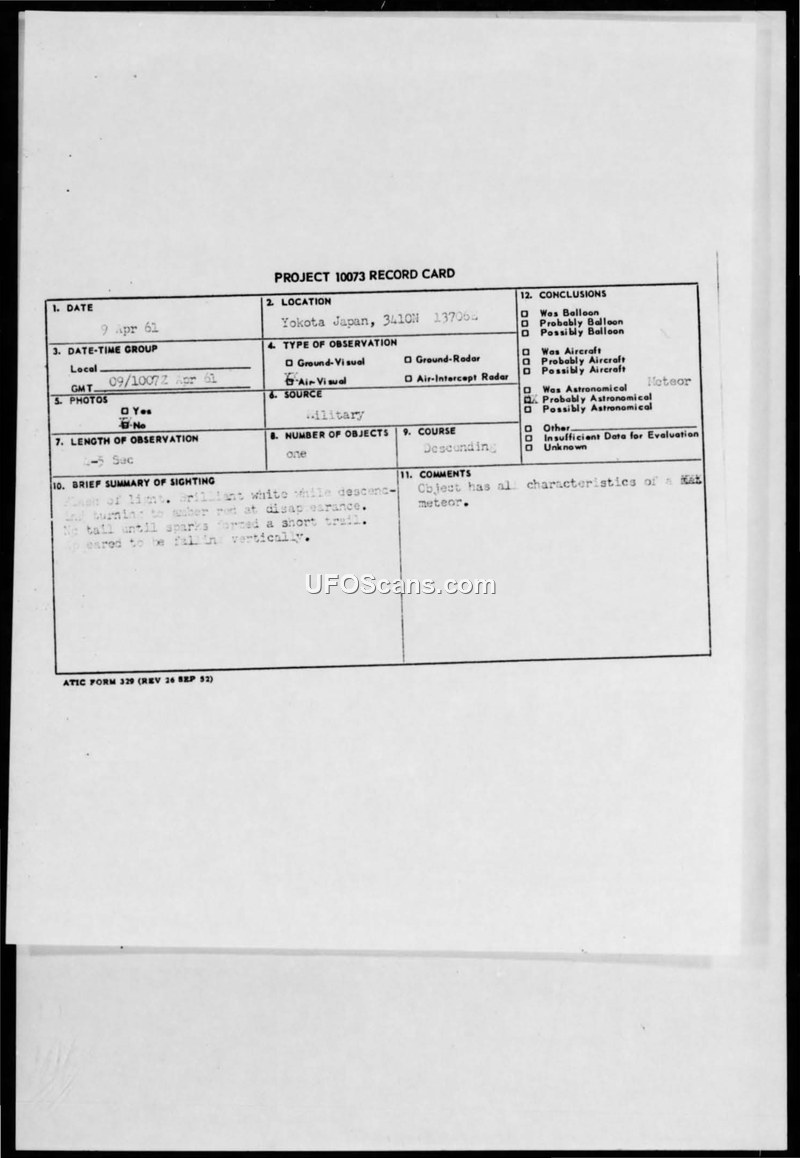 Project 10073 Record Card — Yokota, Japan, 9 April 1961