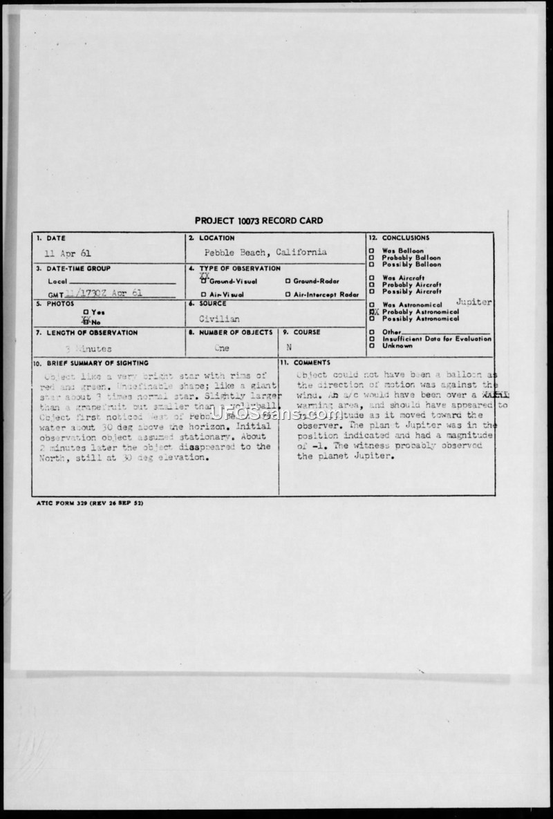 A civilian reported a bright, stationary object in Pebble Beach, California, on April 11, 1961. The Air Force concluded the object was the planet Jupiter.