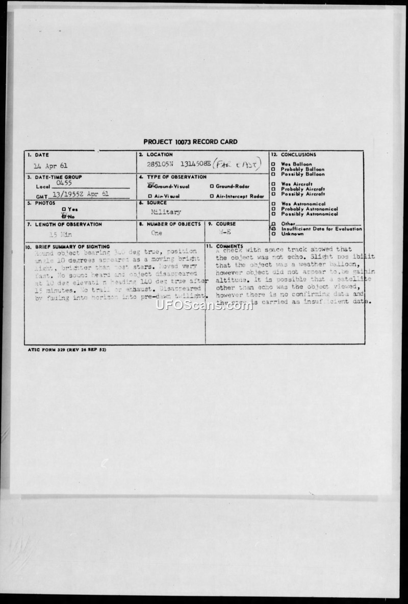 Project 10073 Record Card: Sighting of 14 April 1961