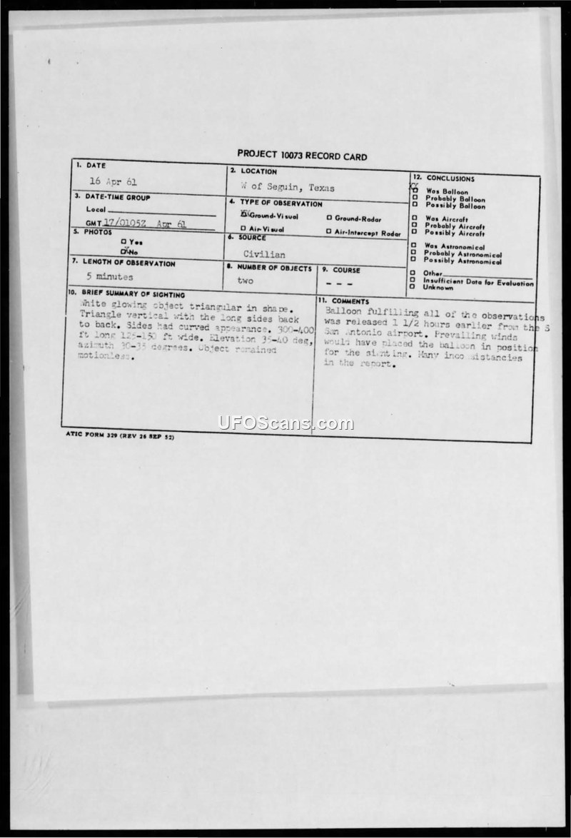 A civilian reported a large triangular UFO near Seguin, Texas, in April 1961. The Air Force investigation concluded the object was a weather balloon reflecting the setting sun.