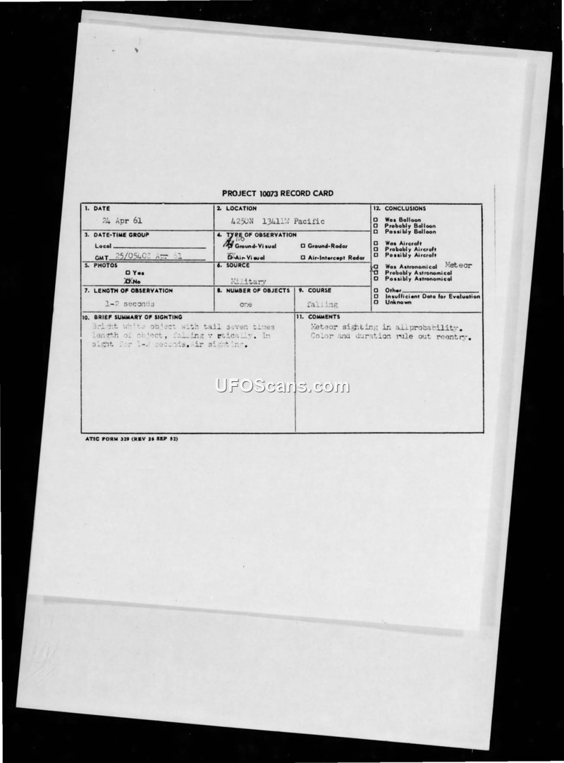 A pilot observed a bright white object falling vertically over the Pacific on 25 April 1961. The Air Force officially concluded the sighting was a meteor.