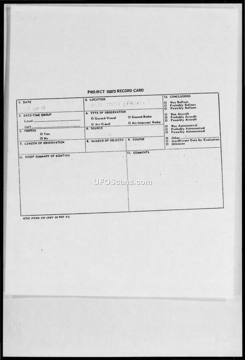 A Project 10073 record card documents a UAP sighting in the Pacific on April 25, 1961. The report includes military communication logs involving multiple command centers.