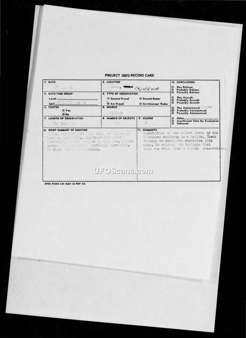 A 1961 sighting of a bluish-white, bullet-shaped object with a fiery tail near Kadena AB, Okinawa, was investigated by the Air Force. The object was officially identified as a bolide (meteor) after independent witness testimony and a check of satellite reentry data.